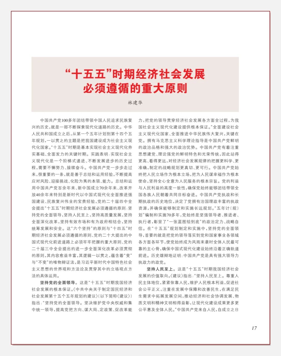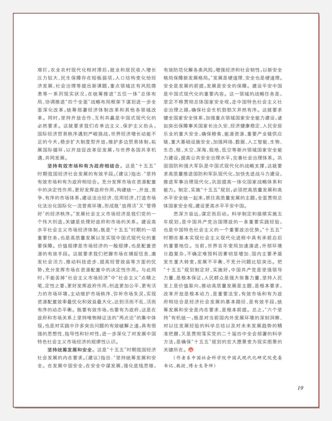 中国共产党100多年团结带领中国人民追求民族复兴的历史,就是一部不断探索现代化道路的历史。中华人民共和国成立之后,从第一个五年计划到第十四个五年规划,一以贯之的主题是把我国建设成为社会主义现代化国家。“十五五”时期是基本实现社会主义现代化夯实基础、全面发力的关键时期。实践表明:实现社会主义现代化是一个阶梯式递进、不断发展进步的历史过程,需要不懈努力、接续奋斗。中国共产党一步步走过来,很重要的一条,就是善于总结和运用经验,不断提高应对风险、迎接挑战、化险为夷的本领、能力。总结和运用中国共产党百余年来、新中国成立70余年来、改革开放40余年来特别是新时代以中国式现代化全面推进强国建设、民族复兴伟业的宝贵经验,党的二十届四中全会提出“十五五”时期经济社会发展必须遵循的原则:坚持党的全面领导,坚持人民至上,坚持高质量发展,坚持全面深化改革,坚持有效市场和有为政府相结合,坚持统筹发展和安全。这“六个坚持”的原则与“十四五”时期经济社会发展必须遵循的原则、党的二十大提出的中国式现代化前进道路上必须牢牢把握的重大原则、党的二十届三中全会提出的进一步全面深化改革必须贯彻的原则,其内容愈益丰富,其逻辑一以贯之,蕴含着“变”与“不变”的唯物辩证法,是习近平新时代中国特色社会主义思想的世界观和方法论及贯穿其中的立场观点方法的具体运用。