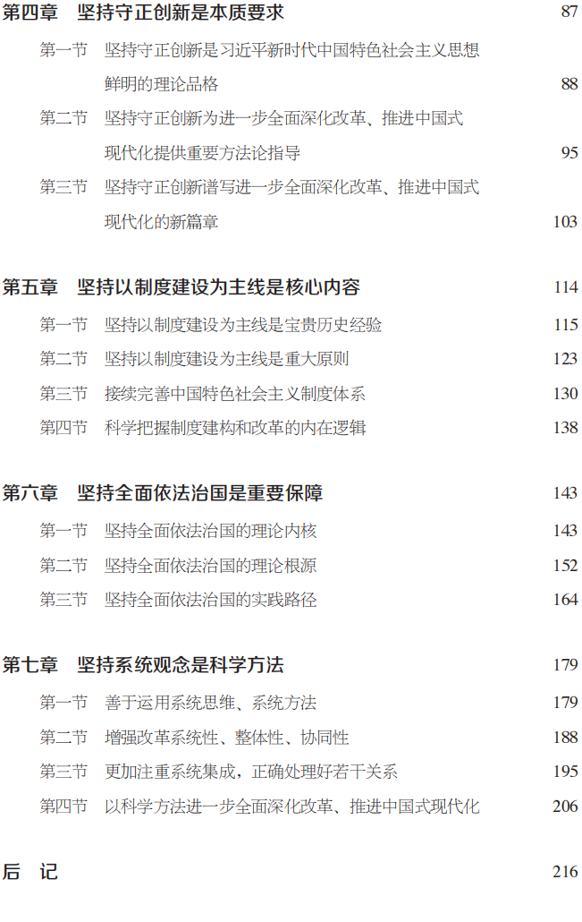 党的二十届三中全会总结和运用改革开放以来特别是新时代全面深化改革的宝贵经验,提出了进一步全面深化改革必须贯彻的“六个坚持”原则,集中体现了习近平总书记关于全面深化改革重要论述的核心要义,为进一步全面深化改革提供了重要遵循。本书从“六个坚持”原则的重大意义、丰富内涵,具体到坚持党的全面领导、坚持以人民为中心、坚持守正创新、坚持以制度建设为主线、坚持全面依法治国、坚持系统观念等六个方面进行具体阐述,便于广大干部群众深刻领会、把握和贯彻“六个坚持”原则,积极投入进一步全面深化改革、推进中国式现代化的生动实践,自觉主动为强国建设、民族复兴伟业作出新的更大贡献。