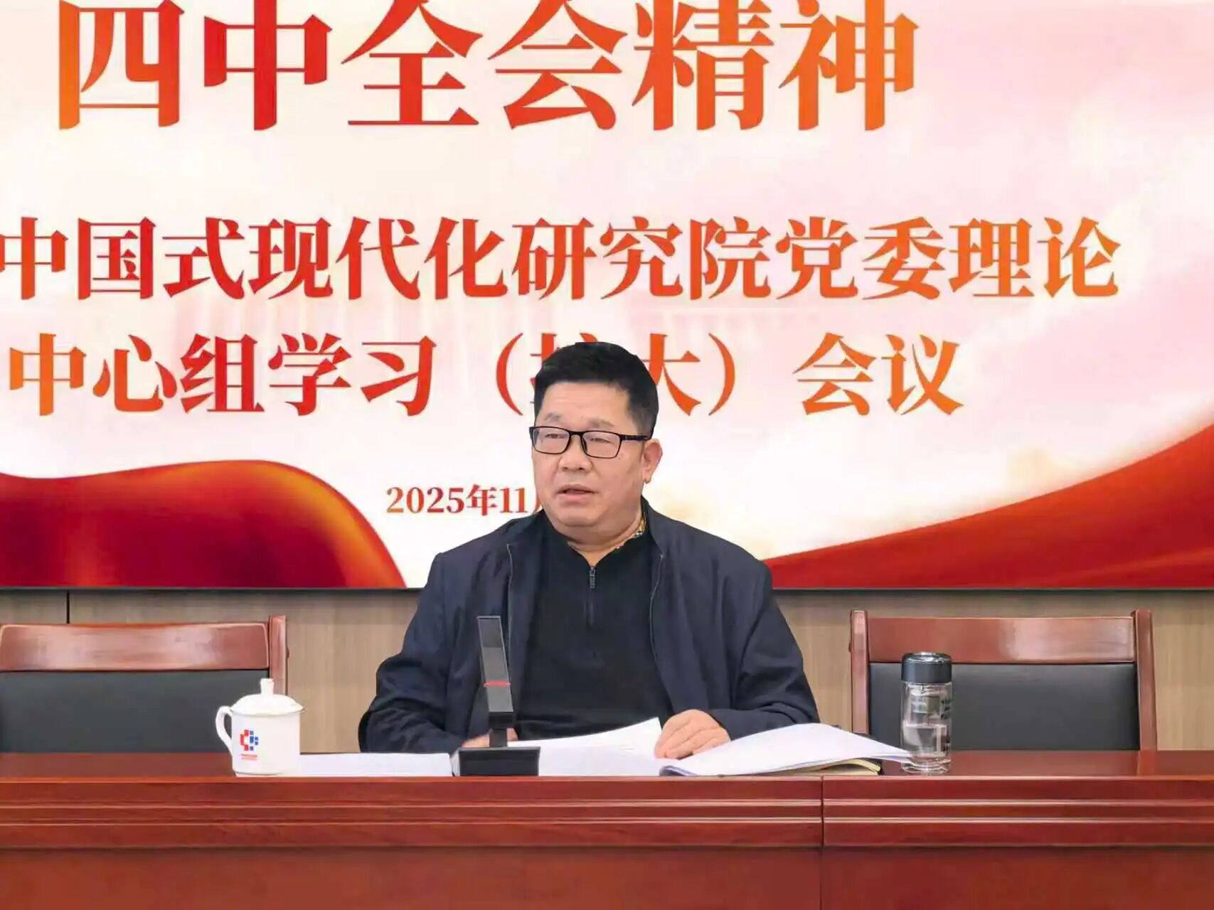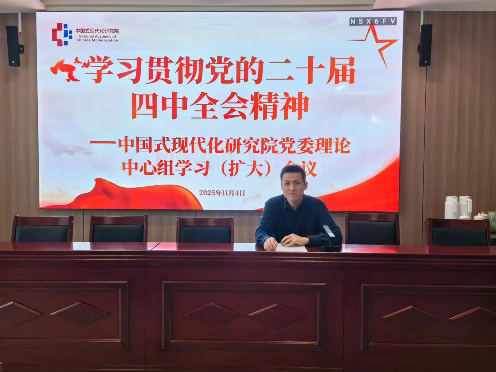 11月4日下午,中国式现代化研究院召开2025年度党委理论学习中心组第七次(扩大)会议,深入学习贯彻党的二十届四中全会精神。党委书记林建华主持会议,院长、党委副书记张冠梓,纪委书记、副院长兼中外比较研究部主任徐秀军和全体干部职工参加会议。张冠梓、李建国作重点发言。